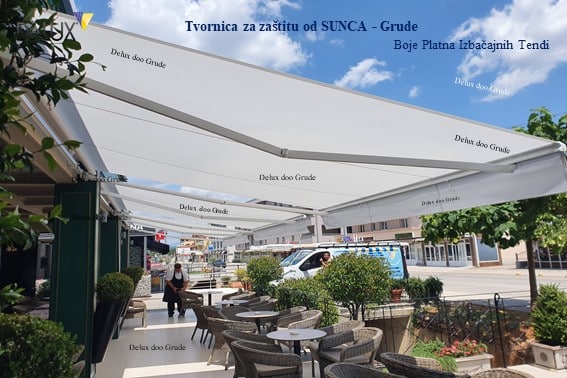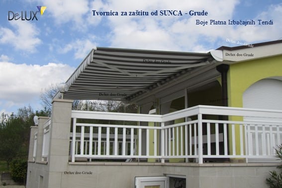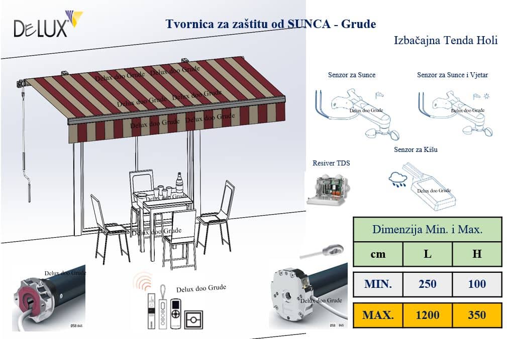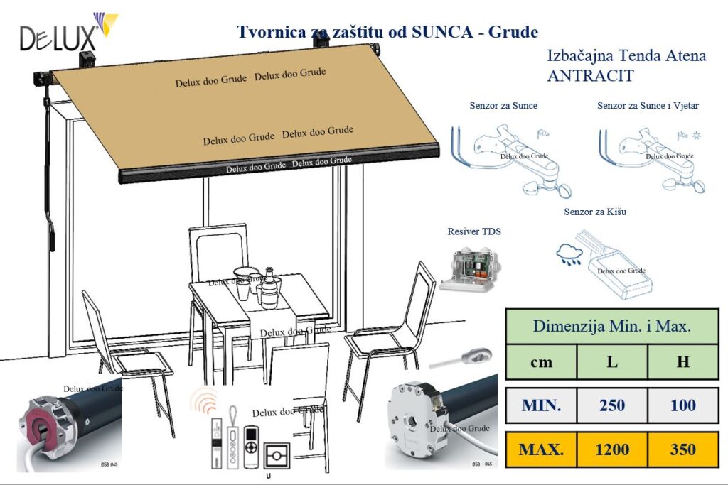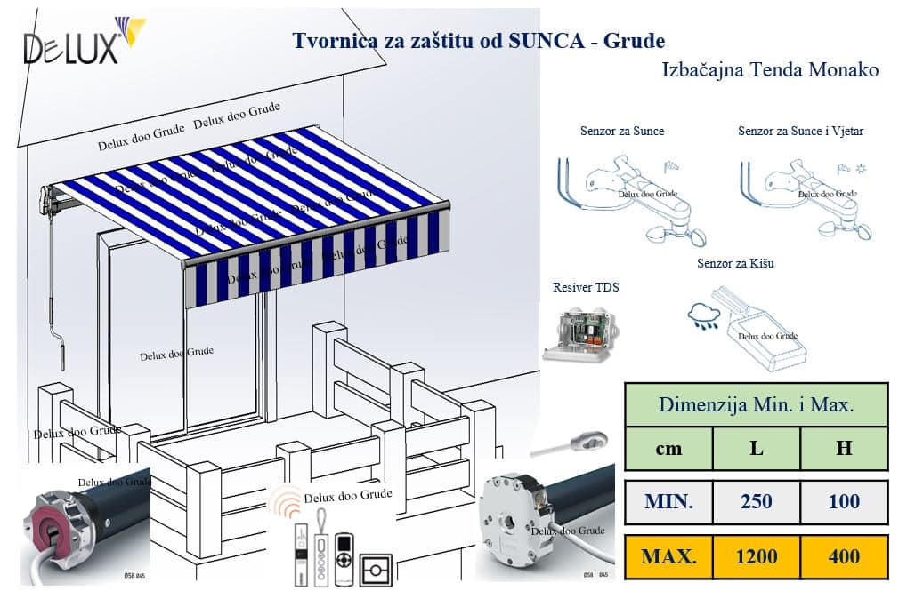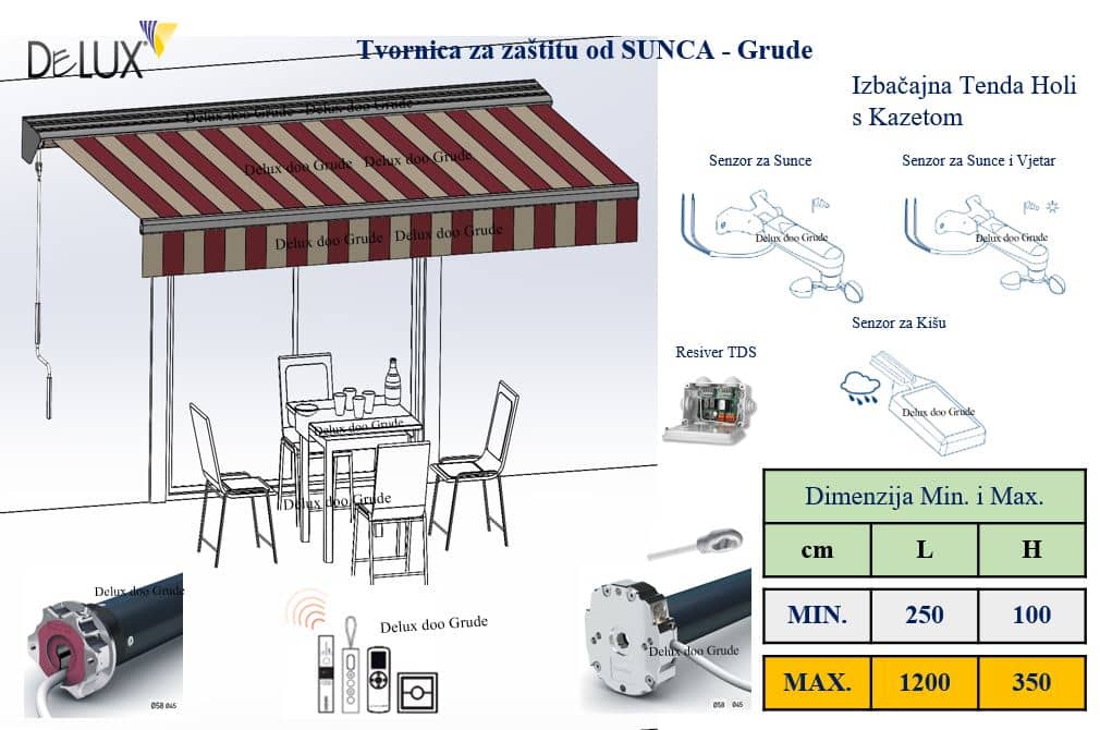 Platno 100 % akril, upravljanje ručno i motorom, Senzor vjetar sunce i kiša.