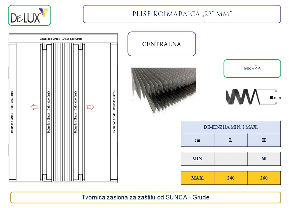 Centralna dvostrana plise komarica s profilom od 22 mm za široke balkonske otvore i klizne stijene