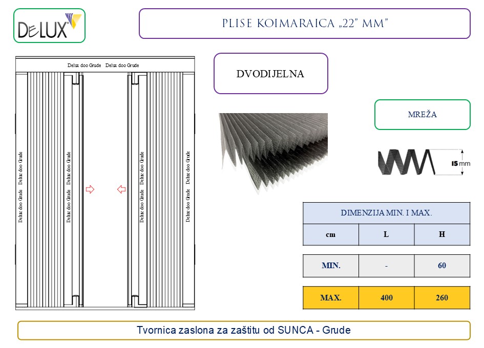 Dvodijelna plise komarica s tankim profilom od 22 mm za dvokrilna vrata s neovisnim krilima