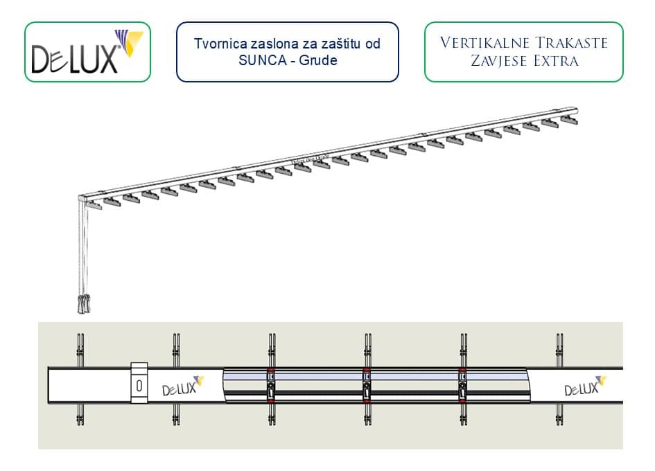 Tehnički nacrt karniše za vertikalne trakaste zavjese Extra s prikazom INOX distancera za povezivanje vozička lamele